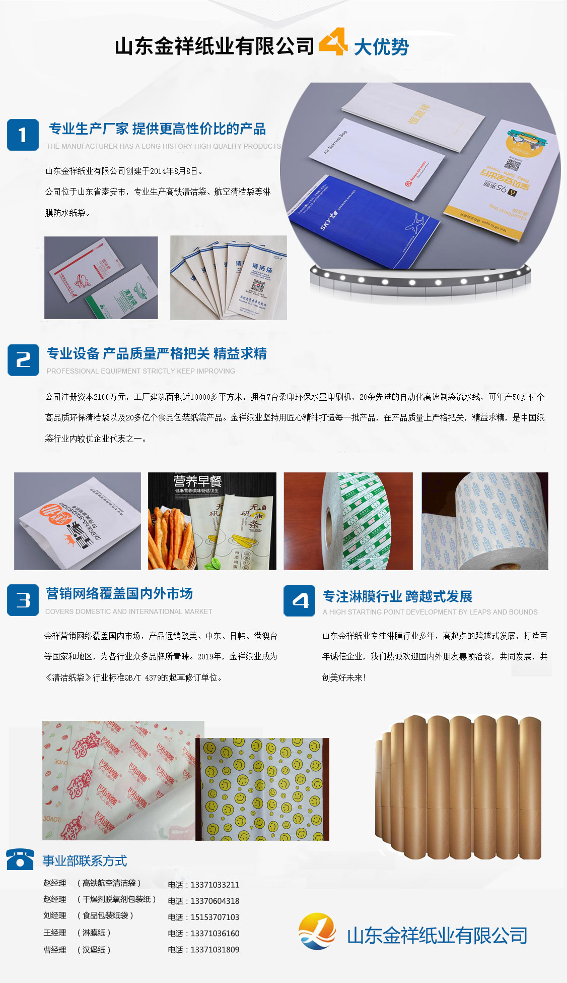 山東金祥紙業有限公司創建于2014年8月8日,公司位于山東泰安,專業生產高鐵清潔袋、航空清潔袋等淋膜防水紙袋。公司注冊資本2100萬元,工廠建筑面積近10000多平方米,擁有7臺柔印環(huán)保水墨印刷機,20條先進的自動化高速制袋流水線,可年產50多億個高品質環(huán)保清潔袋以及20多億個食品包裝紙袋產品。金祥紙業堅持用匠心精神打造每一批產品,在產品質量上嚴格把關,精益求精,是中國紙袋行業內較優(yōu)企業代表之一。金祥營銷網絡覆蓋國內市場,產品遠銷歐美、中東、日韓、港澳臺等國家和地區,為各行業眾多品牌所青睞。2019年,金祥紙業成為《清潔紙袋》行業標準QB/T 4379的起草修訂單位。